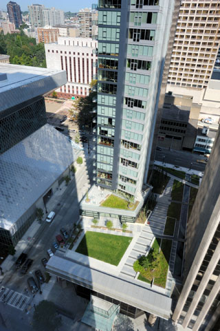 It's hard to keep your feet on track along Fifth Avenue between Madison and Marion streets these days. New terraces, combined with a coursing stream and falling water, tend to pull you into the plaza just above. Once you climb up to see what's going on, there are plenty of places to rest and a lot to look at.