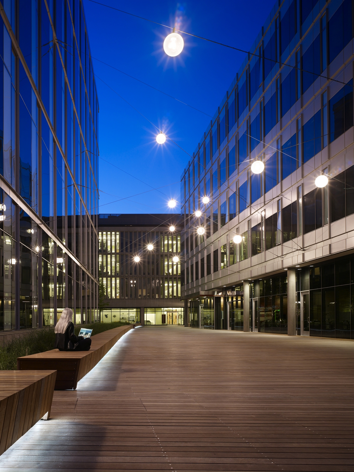 Off the north side of Republican Street, between Ninth Avenue North and Eighth Avenue North, a wide-open boardwalk takes off into the heart of a new campus. Between the strikingly modern glass and steel walls, light globes hang invitingly.