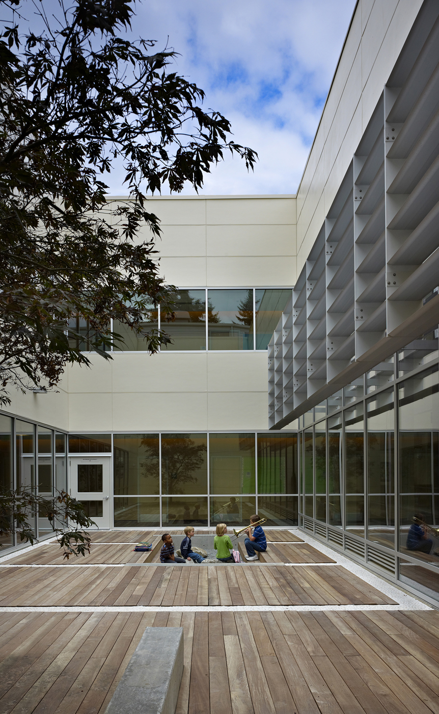 The openness of that interior is breathtaking. Abundant light in the library comes not from perimeter walls but from a large skylight overhead. Light also washes in through a two-story glass wall with an enclosed outdoor space on the other side. Kids regularly flood into the courtyard for activities or just to let off steam, perching on the edges of a sunken Zen garden or benches next to a single maple tree.