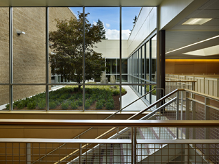 As per teachers’ wishes, the new classrooms are enclosed and rectilinear, but also light and open. Views of the largely wooded perimeter fill the building, and glass panels in inner walls give the ring of corridors a very open feeling as well.