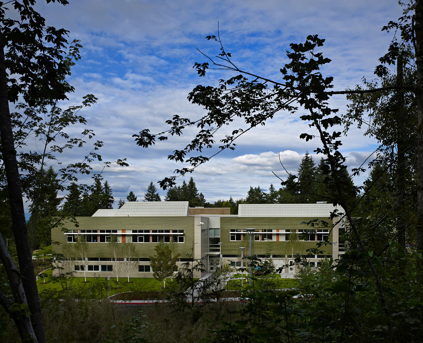 The original building was all on one level, but the program for the new building called for about twice the space. Building on two levels allowed the school district to reserve an important part of the site: the ski hill and natural areas.