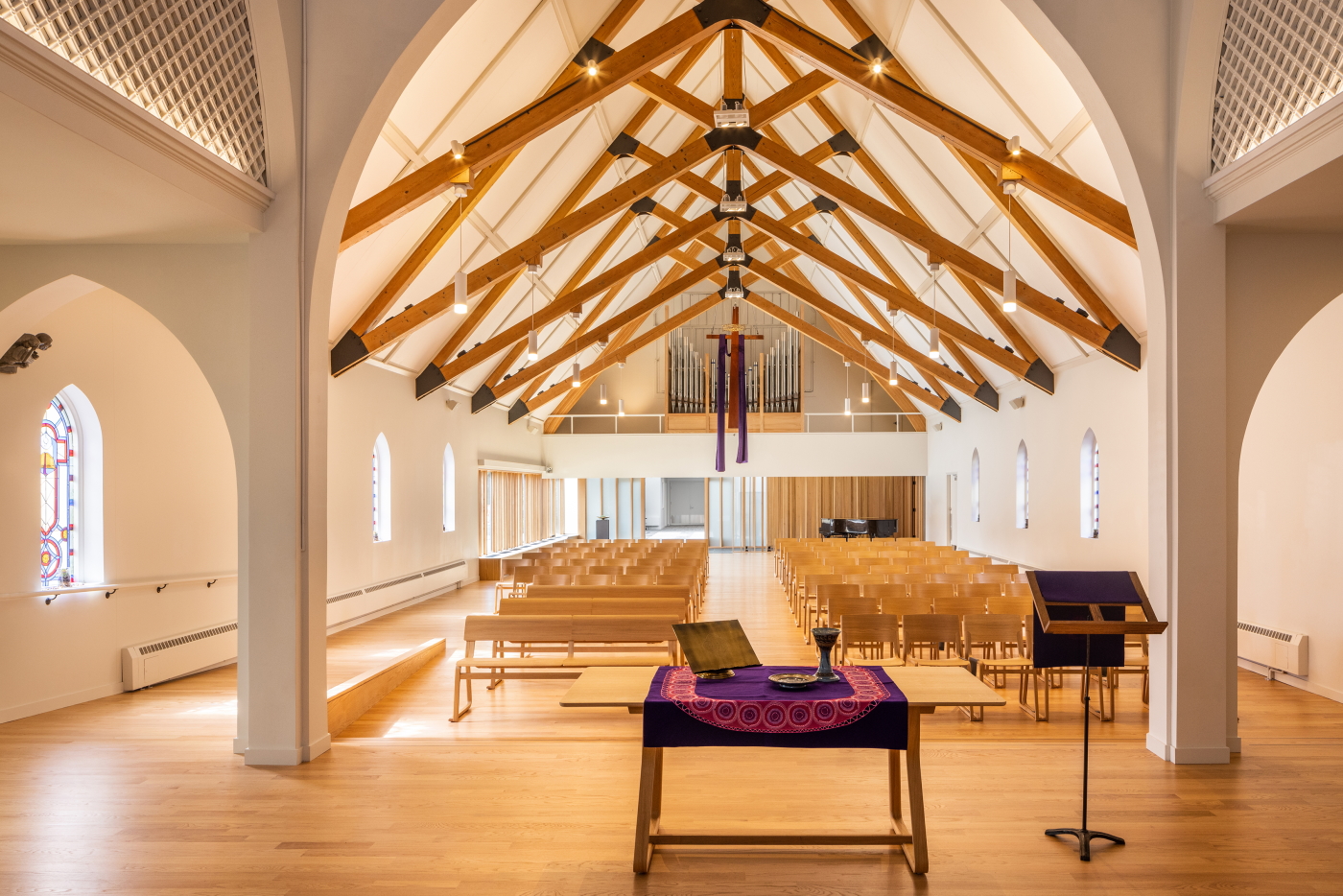 Structural improvements in the sanctuary anchored the original timber trusses to seismic braces concealed within the masonry walls.
