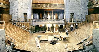 But first they had to ready the building. In preparation for the dome and interior work, Mortenson's workers erected scaffolding outside the dome, and covered the main stairs, public hallways, and much of the remaining interior in thousands of feet of chipboard to protect the beautiful marble, carpets and decorative pieces that could not be moved. When the project is over, Mortenson will donate the particleboard to Habitat for Humanity.