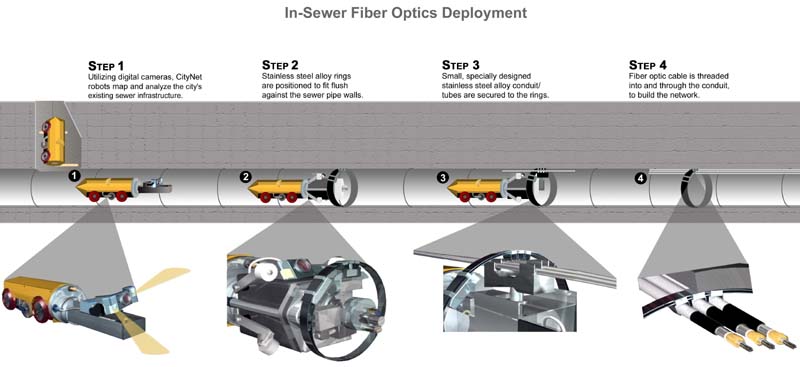 CityNet's process for installing fiber optic cables in sewer lines. Click here for a larger picture.