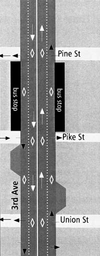 After: Only transit and emergency vehicles will be able to use Third during rush hour. Cars will be allowed to turn onto Third, but must turn right at the next block.<