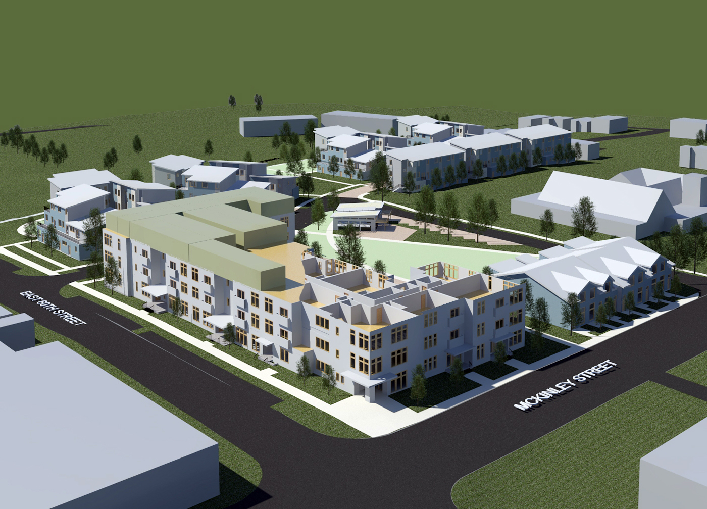 The modular development called Hillsdale Heights will include 60 apartments, 50 townhomes, a community center and green space.
