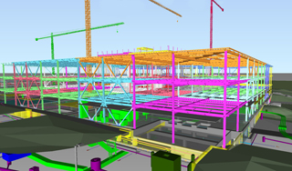 This consolidated model snapshot shows site utilities, structure, crane erection phasing and more. Colors note which steel delivery should be erected by which crane, helping save time and reduce errors.
