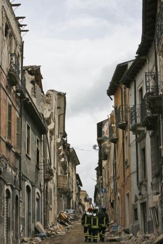 Firefighters on April 13 check destroyed buildings in central L’Aquila, Italy, a week after a deadly earthquake damaged thousands of buildings