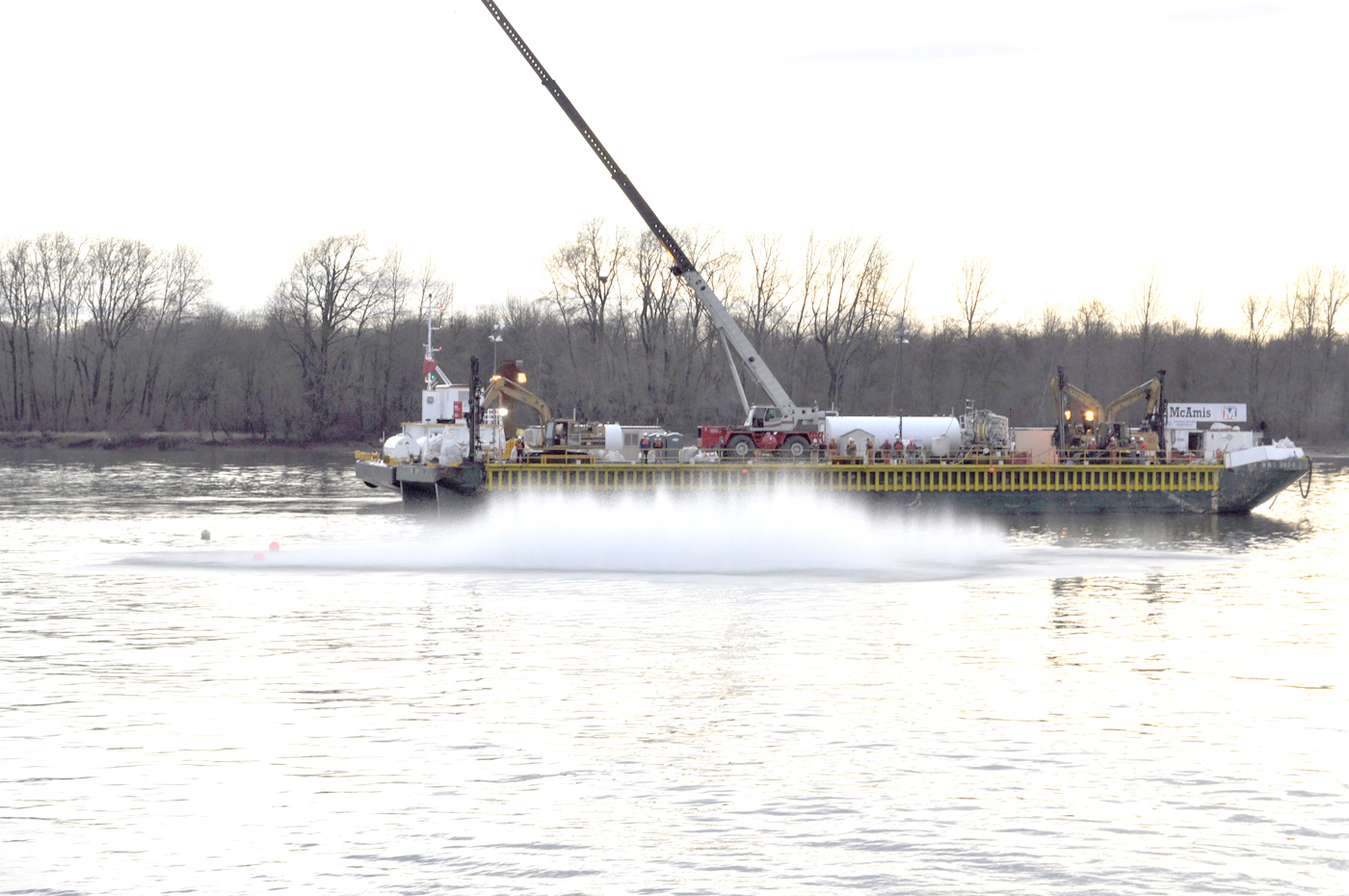 SIRENS on a blast platform floating on the Columbia River near St. Helens, Ore., begin screeching. It's a signal that crews are about to set off another round of explosives nearly 60 feet below the surface of the river.
