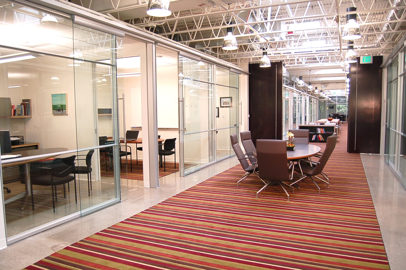 GLY’s headquarters has a central circulation spine with spaces to hold informal meetings.