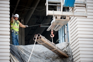 An Apollo worker prepares to receive a load of pipe at a Denver jobsite.