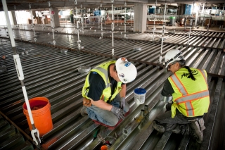 Two Apollo Mechanical workers test second-story mechanical systems at a hospital project.