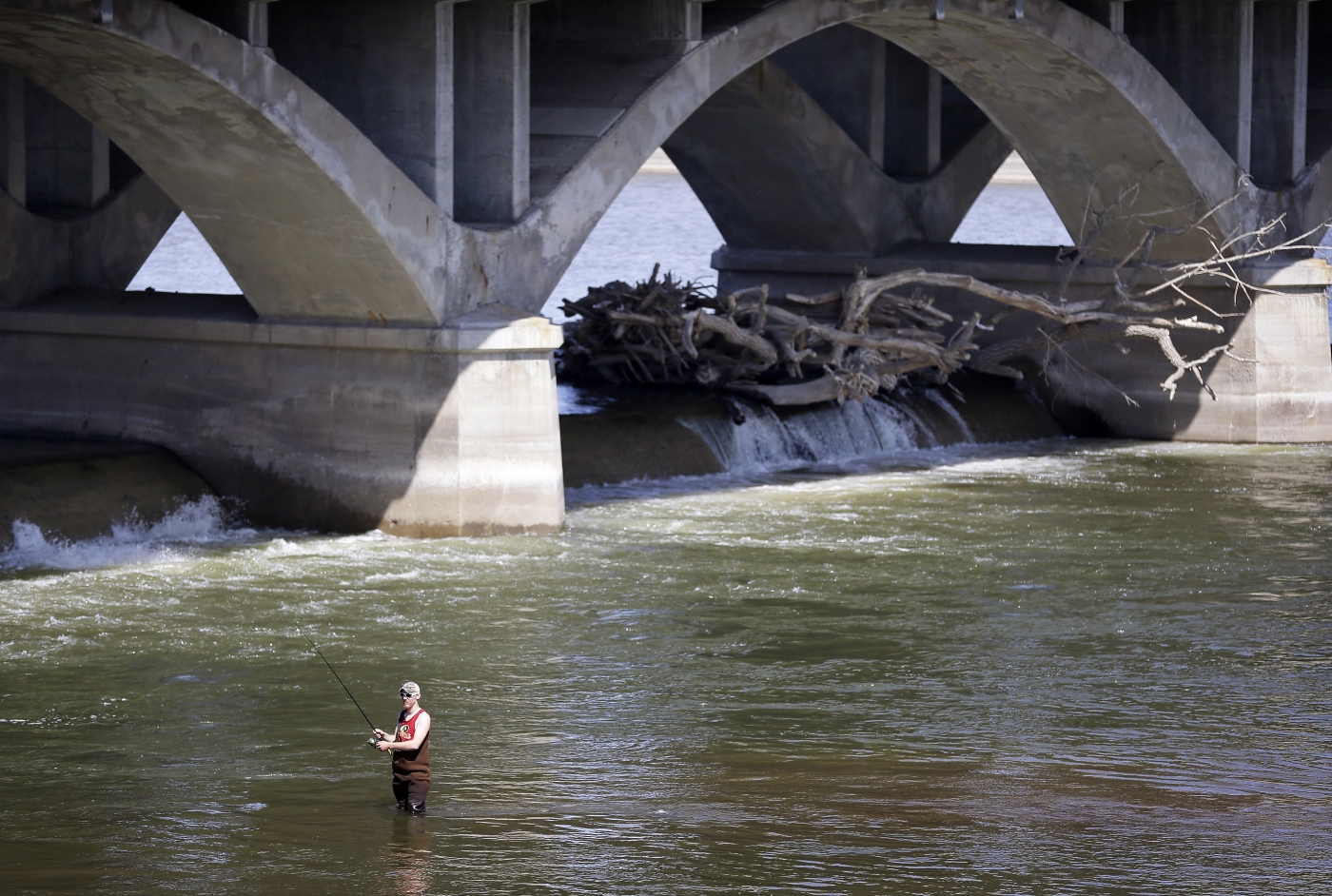 A fisherman casts his line earlier this month below the Scott Street dam in Des Moines, Iowa. It and another low-head dam downtown have claimed at least 15 lives.