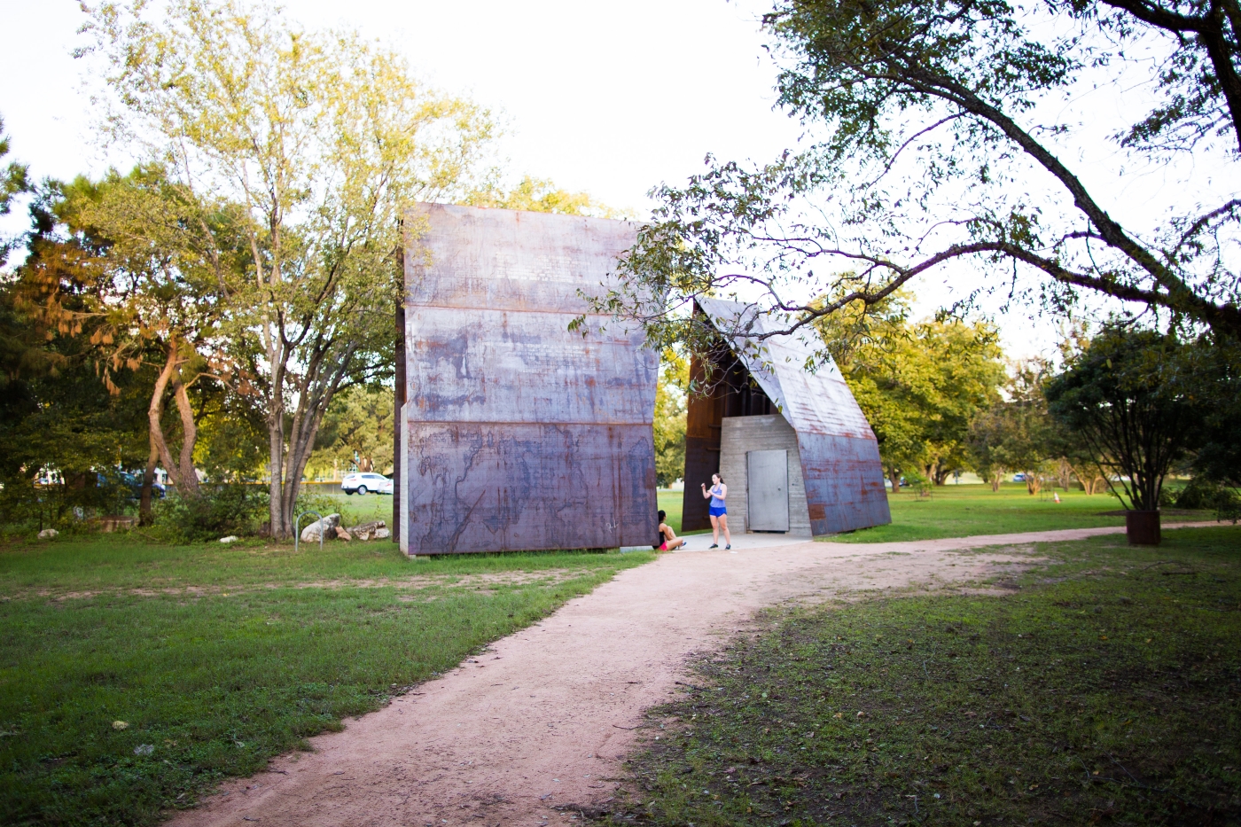 Martell described the restrooms as sculptural, tent-like forms with rusty steel exteriors. The structural overhangs offer shade from the hot Texas sun, and the concrete interiors are open up top to allow breezes and emergency access.
