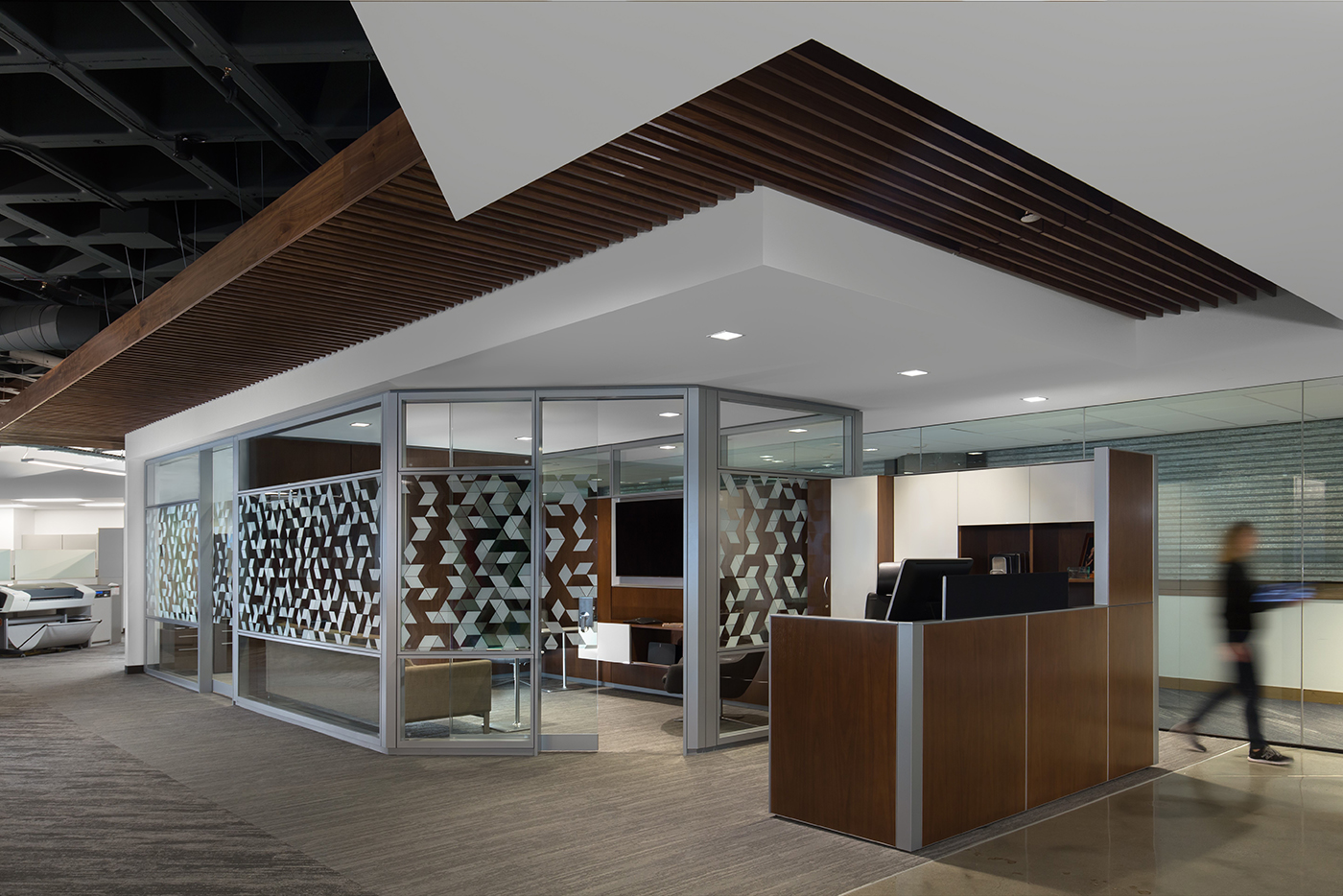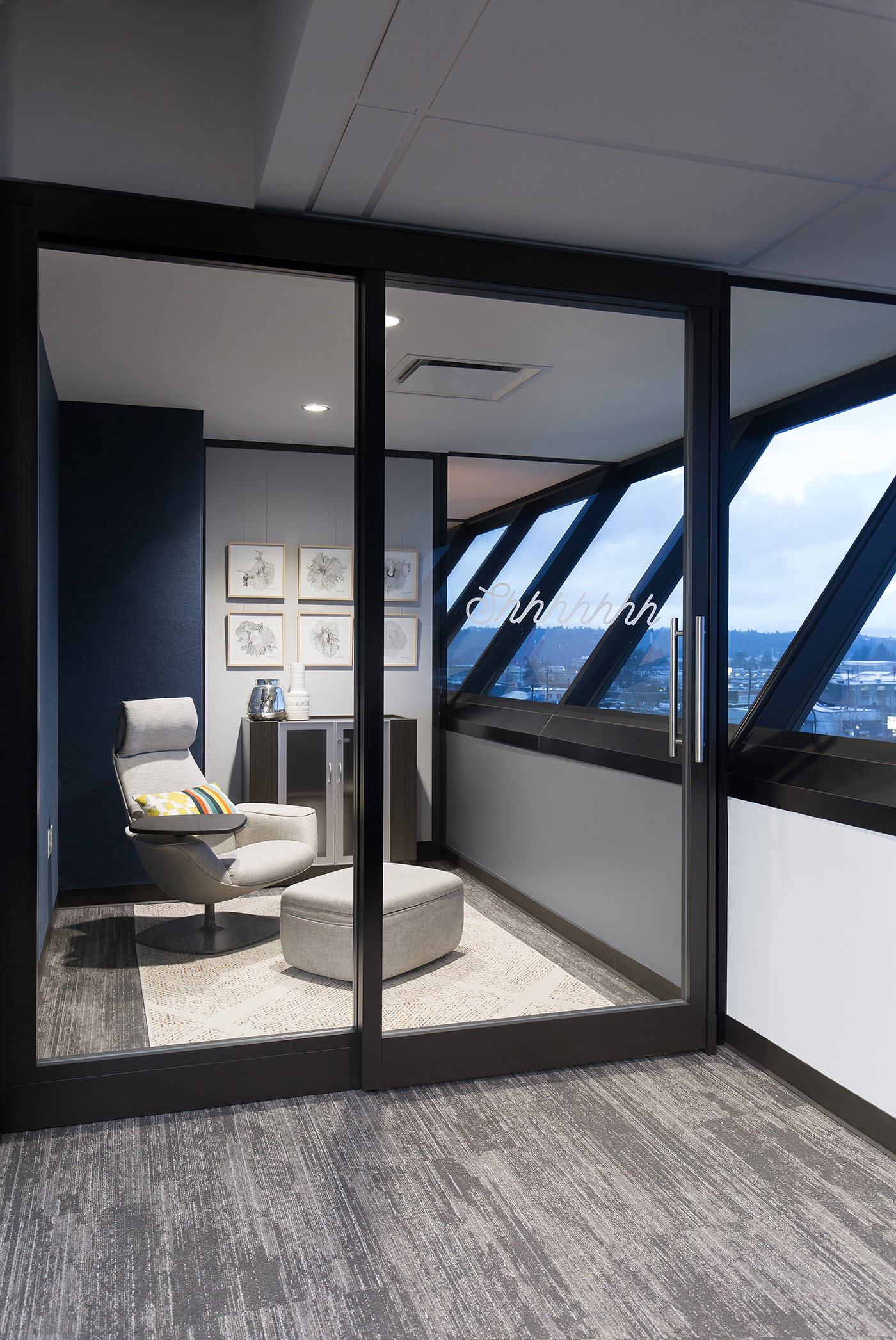 Glass walls keep out ambient noise and also provide privacy through “cloaking technology” that obscures digital screens to passersby.