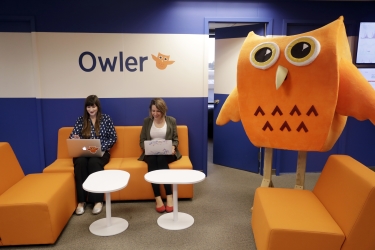 Owler employees Nicole Lopuch, left, and Molly Cornfield work in the company’s offices in California. Bright orange furniture and the company’s mascot make the space more cheerful.
