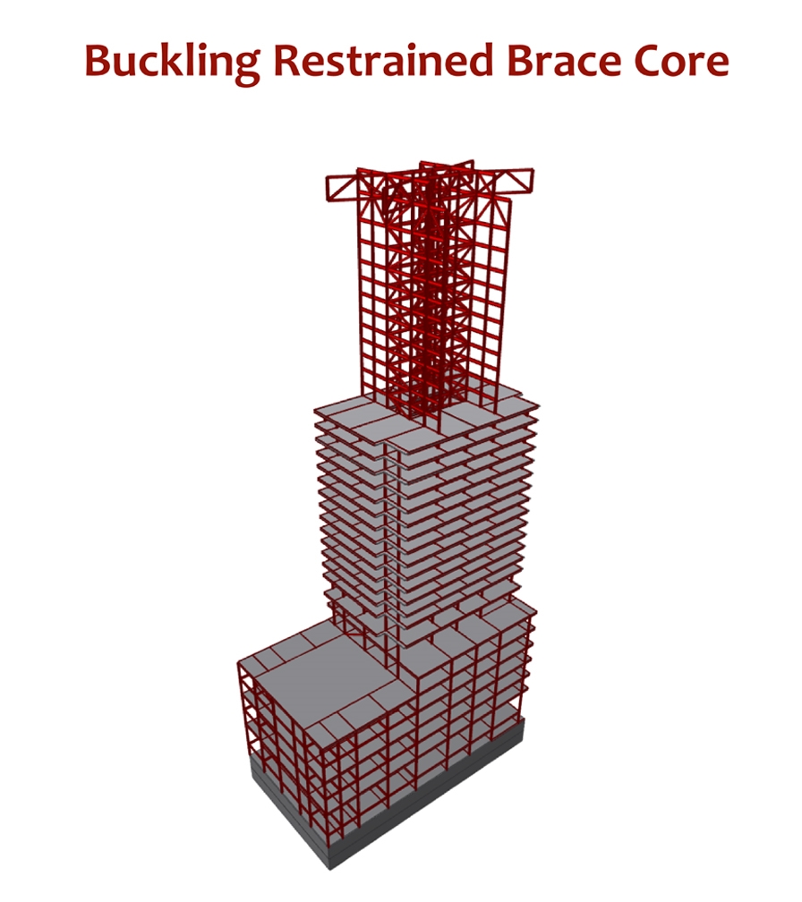 By using the buckling restrained bracing system, the building's structure will go up twice as fast as a conventional concrete core building, while using less concrete and steel. Floors of the hotel will incorporate lightweight concrete to reduce seismic and gravity loads on the structural frame and foundation.