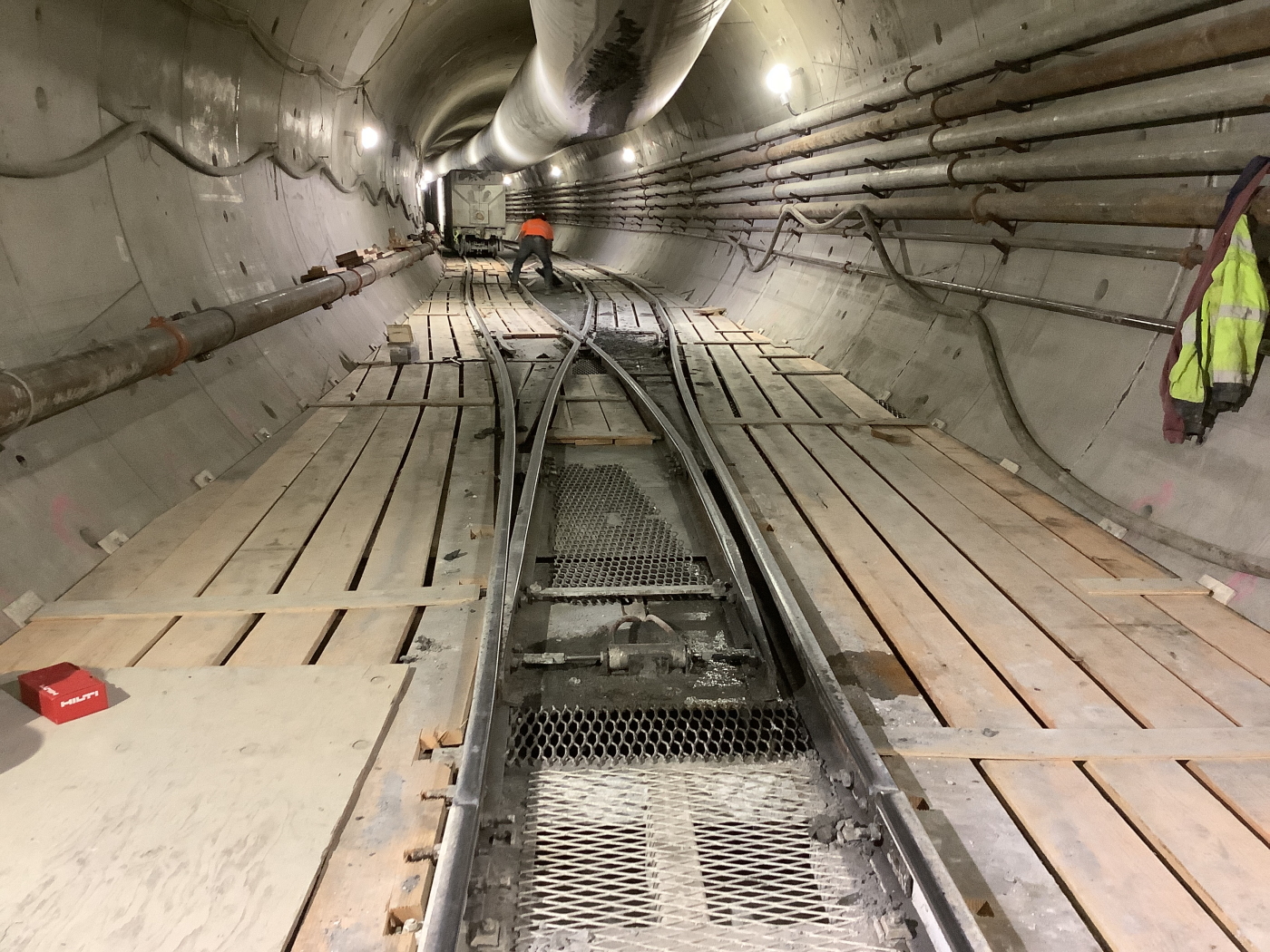 A crew member installs decking inside the tunnel alongside the rail system. Rail cars move supplies to MudHoney and transport soil from the machine to the Ballard shaft site for disposal.