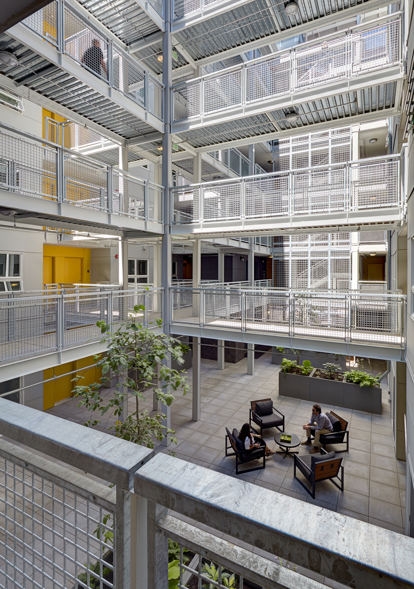 An open-air interior courtyard lets natural light into all of the units and allows for passive cooling. A reverse-cycle chiller transfers latent heat from the air in the garage to the domestic hot-water supply.