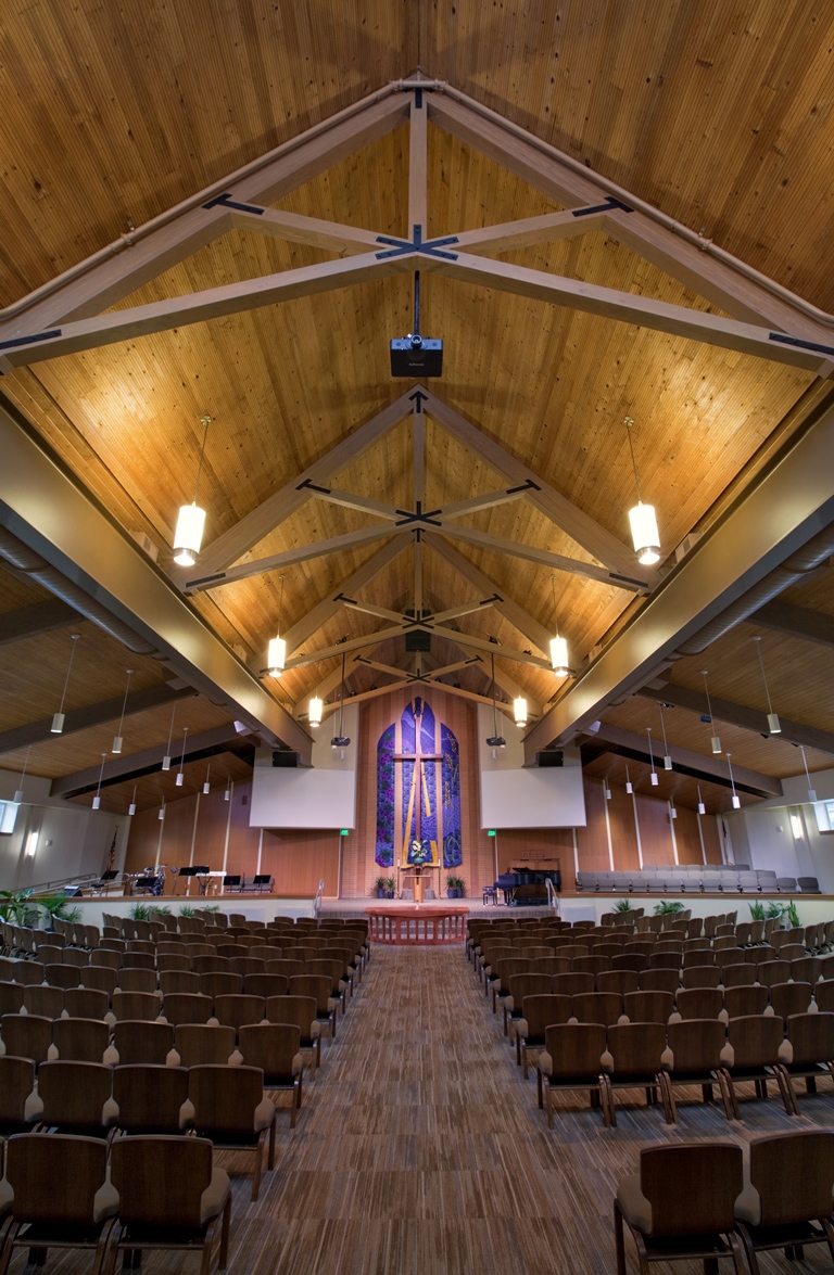 To expand the sanctuary, two 80-foot-long steel beams were installed to replace wood support columns. The reconfigured area has nearly doubled the amount of seating.