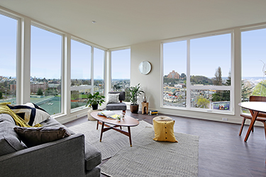 Units have Energy Star appliances, quartz countertops, wood-plank flooring, large windows, washer/dryer and wall-mounted bike storage.