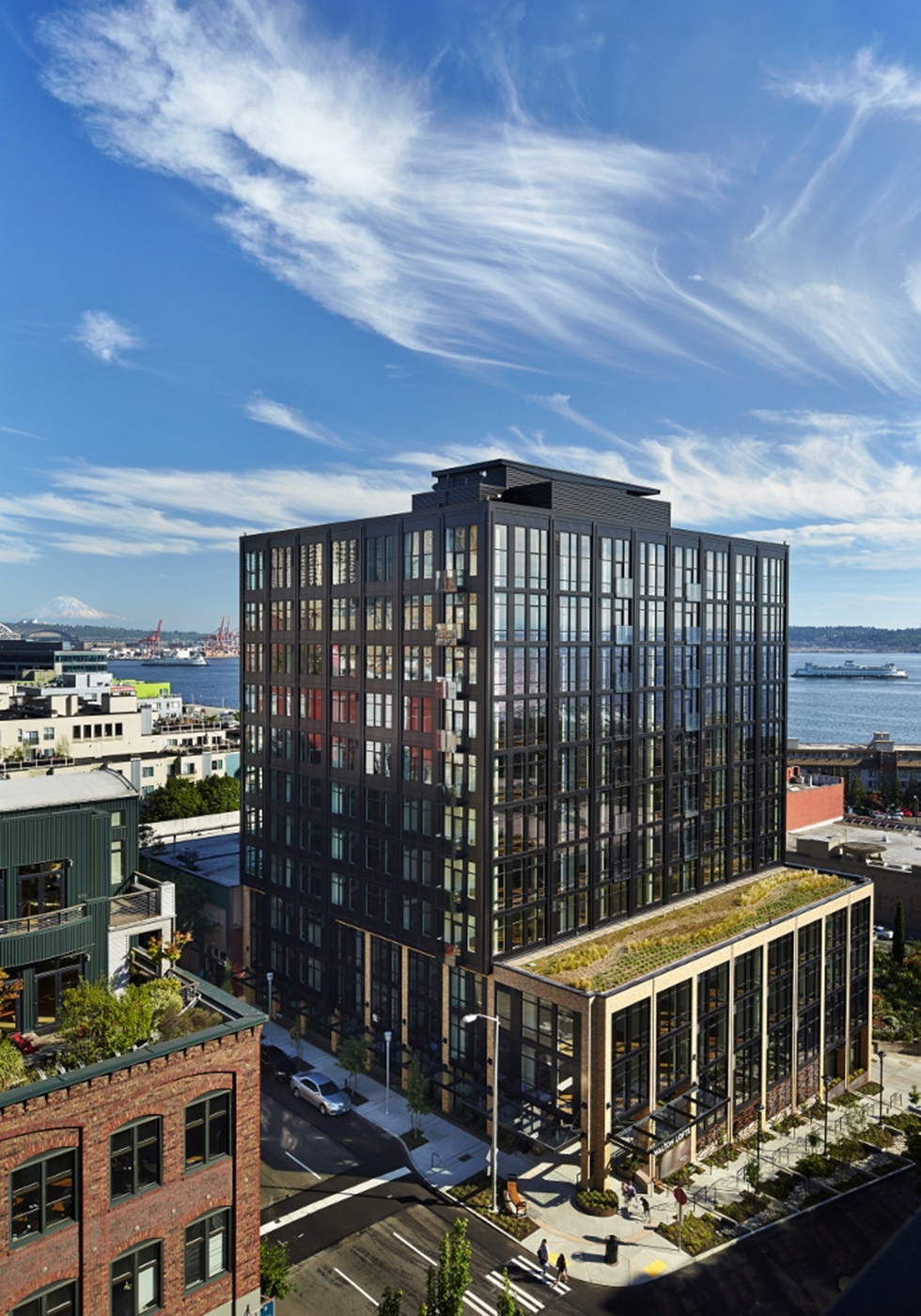 The building has a library, private guest suite for visitors, bicycle workshop and storage, rooftop pet walk and deck with views of Elliott Bay.