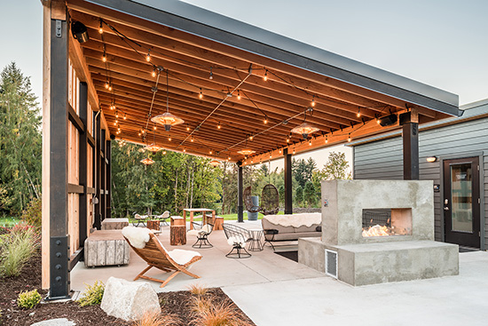 The 10,600-square-foot site also has two communal spaces: an enclosed public house and an open-air pavilion with a cement fireplace. Both of those spaces can be reserved for private events.
