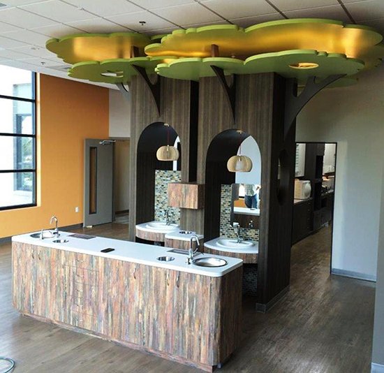 Design for the 4,247-square-foot space uses games and bright colors to create a fun atmosphere for younger patients, such as a giant tree at the brushing station. The general practice side has warm colors and comfortable chairs that cater to adults.