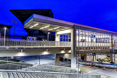 UW Station has a ground-level entrance southeast of the stadium and an entrance from the new pedestrian bridge that crosses Montlake Boulevard. Riders board trains underground, and can get to Capitol Hill in four minutes, to downtown Seattle in eight, and to Sea-Tac Airport in about 45 minutes.