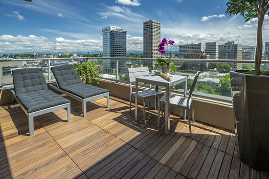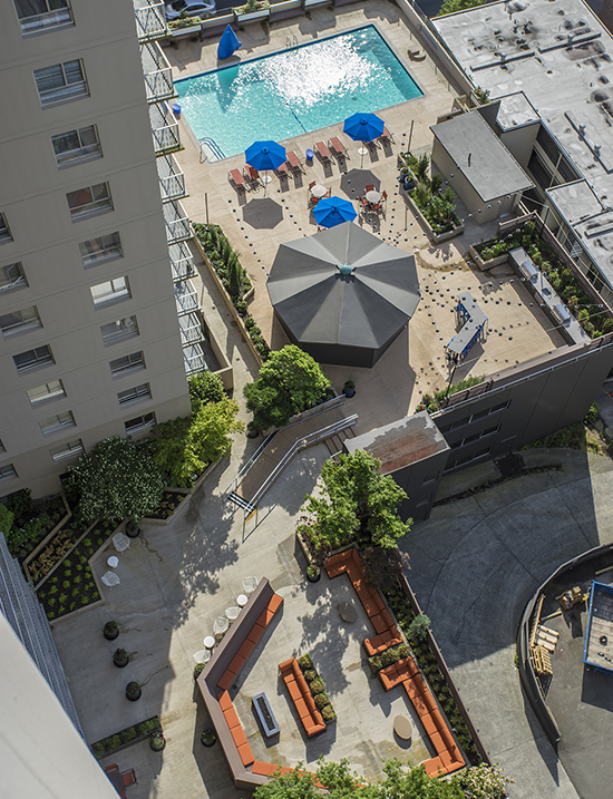 There are one-, two- and three-bedroom apartments as well as penthouses. Most units have 175-square-foot patios. The owner had considered turning large apartments into smaller units, but decided that having larger units would differentiate the building in this market.