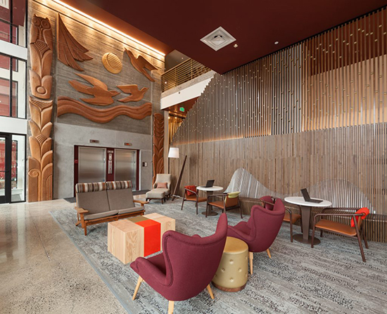 There are two-bedroom, one-bedroom, live/work units, lofts and studios, with at least one parking stall for every unit. Amenities include a residential lobby, community room and a two-story courtyard with community spaces. There is also a demonstration kitchen with a large dining room.