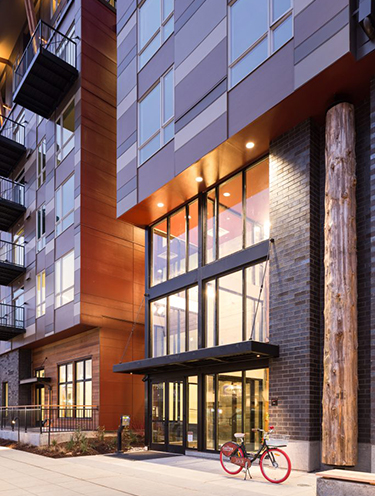 The seven-story, LEED gold building was named for the late local artist Dudley Carter, whose work is featured in the building. It is near downtown, Sammamish River Trail and Dudley Carter Park.