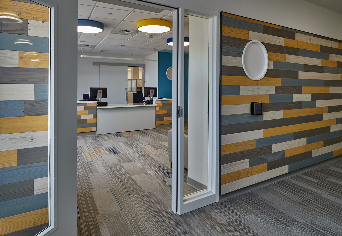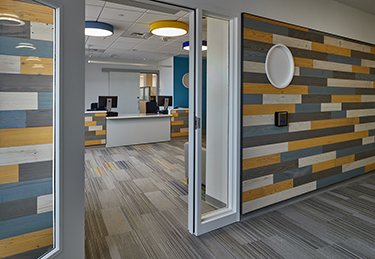 Each therapy room represents a different bird and resembles a treehouse to encourage movement throughout the space. Wood detailing and a palette of blues, reds and oranges were used to make the space feel youthful and uplifting.