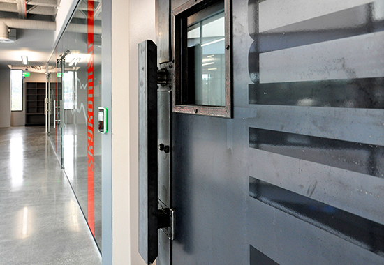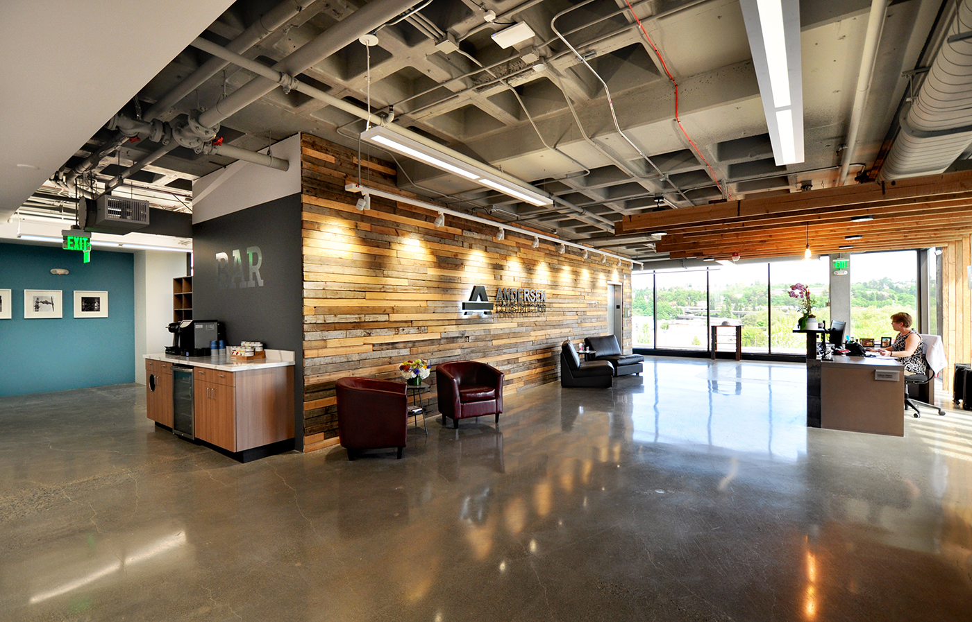 Many elements were built and designed by Andersen employees, including sliding steel doors, wood tables and a concrete bar top.