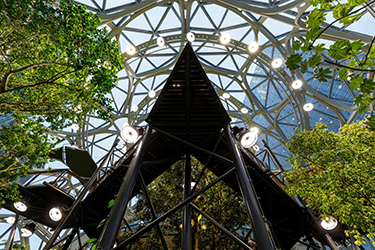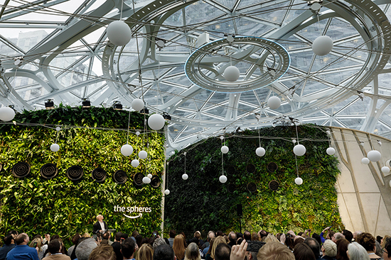 There are four levels inside the Spheres, and a total of 130,000 square feet, filled with treehouse meeting rooms, waterfalls, palladiums and a four-story living wall.
