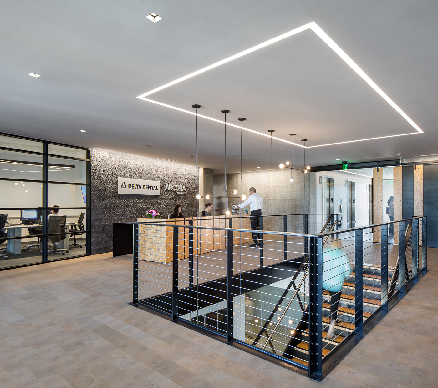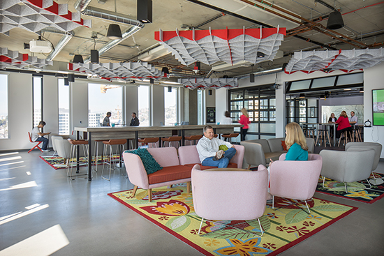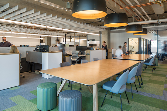 The office uses an open-concept floor plan, with a mix of open and structured space, architectural panel and hard lid ceilings, chilled beam HVAC system, and interconnecting stairs.