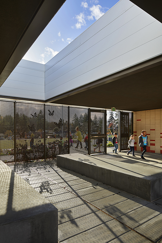 A library serves as a commons area and community space. Outside, courtyards are adjacent to the classrooms and the playground incorporates a grassy hill into the play area.