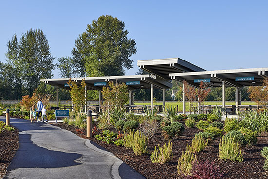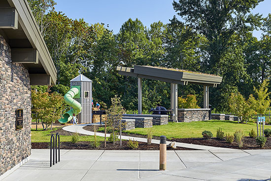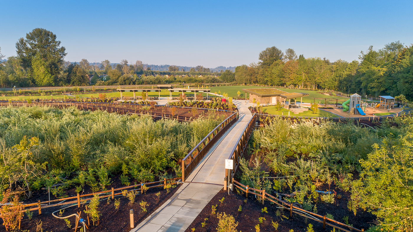 There are trails, rain gardens, open grassy space, native plants, rehabilitated wetlands, a walking bridge, play structures, picnic shelters, interpretive signage and views of Wapato Creek.