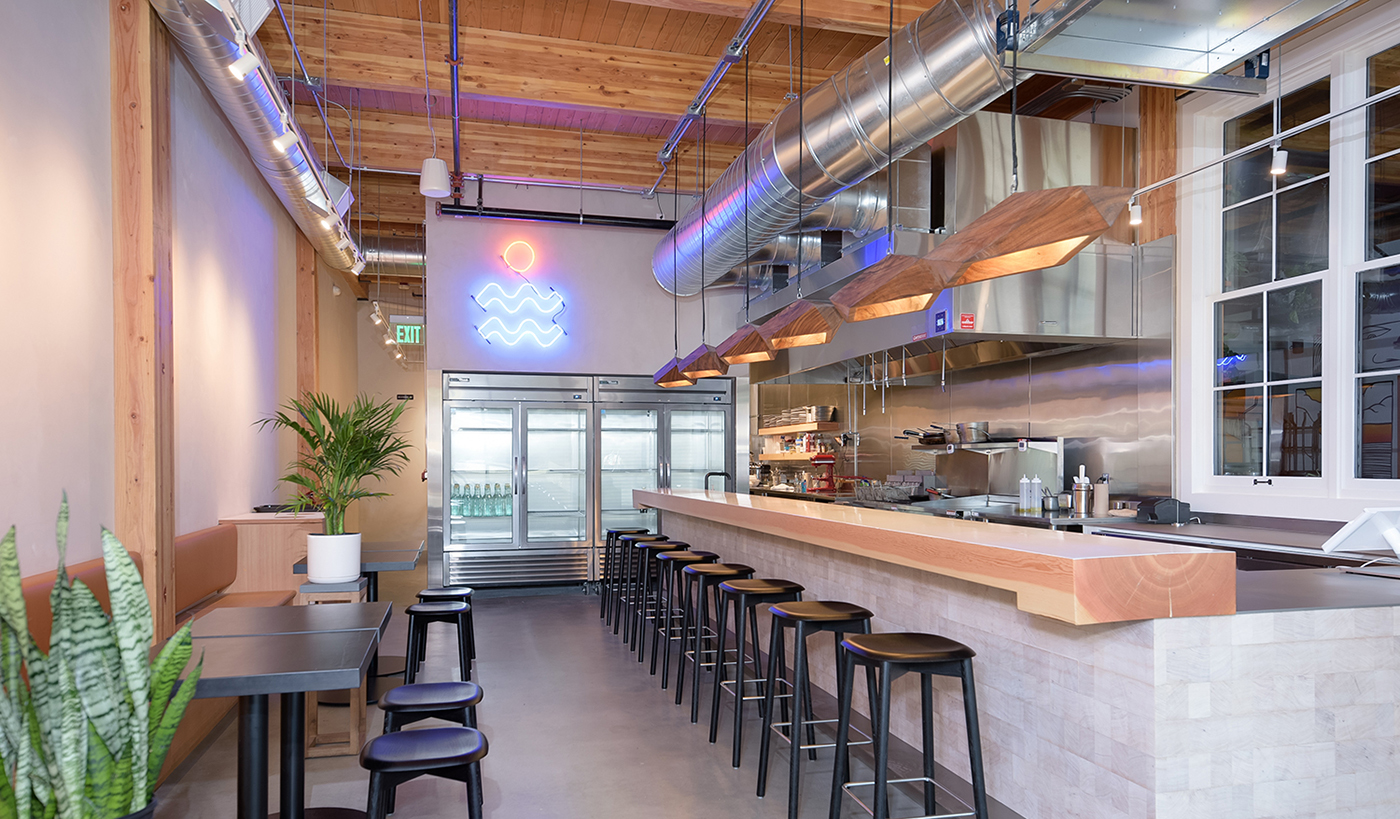 Bright display fridges show off fresh ingredients. A window to Aslan Brewing next door lets light and flavors pass back and forth.
