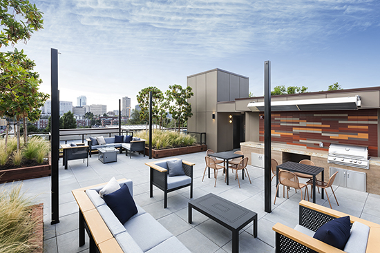 Amenities include a fitness center, rooftop deck with views, and parking in the below-grade garage.