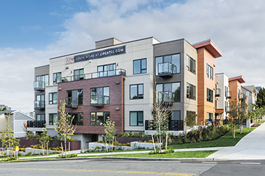 The 51,715-square-foot project was built across two lots, which were zoned differently. In order to respect zoning requirements, apartments are located on the lot adjacent to the main street, while townhomes are located on the lot to the north. This optimizes development of the site, while offering diverse rental options.