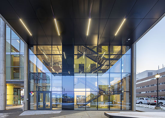 The exterior plays off the red-brick look in a new way — with a high-performance precast concrete facade panel system clad in a sculpted, red-brick veneer.