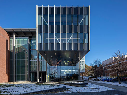 A two-floor cantilever faces west towards Martin Stadium. A new landscaped approach creates a public space for the university.