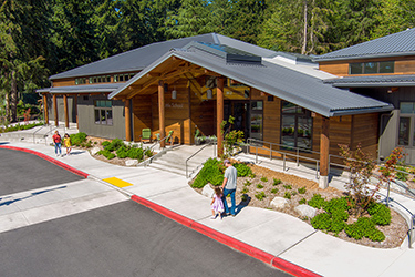 The new Rivers Building is a single-story, 14,808 square-foot multipurpose facility that serves as a gateway to the campus. Extensive use of wood in the columns, details and open scissor trusses echo the surrounding forests. Large skylights and clerestory windows provide an airy atmosphere. Students, staff and visitors enter from either end of the lobby, which can open to the outdoors using operable glazed walls.