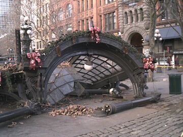 SEATTLE (AP) — The historic iron and glass pergola at Pioneer Square, a national historic landmark and one of the city's most famous meeting spots, was knocked over by a truck and smashed into pieces early Monday.