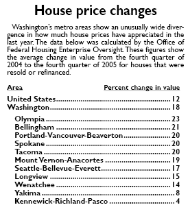 Public bonanza On the public side, the federal government is increasing its grants to states for highway construction, defense and homeland security-related projects. Most states have received unexpectedly large amounts of sales, income or severance taxes, and are putting some of that money into construction of university and adult-education facilities, parks and conservation, courts and correctional institutions, and water and sewer projects. Local governments and school districts nationwide that depend on property-tax receipts have benefited from the steep rise in property values. One measure of that increase is the house price index posted on March 1 by the Office of Federal Housing Enterprise Oversight. OFHEO calculated the average increase between the fourth quarter of 2004 and the fourth quarter of 2005 in the value of houses that were resold or refinanced using loans from Freddie Mac or Fannie Mae. Appreciation averaged 13 percent nationwide and 18 percent in Washington. OFHEO also calculated appreciation for 11 metro areas, ranging from 4 percent in Kennewick-Richland-Pasco to 23 percent in Olympia.