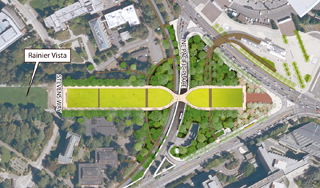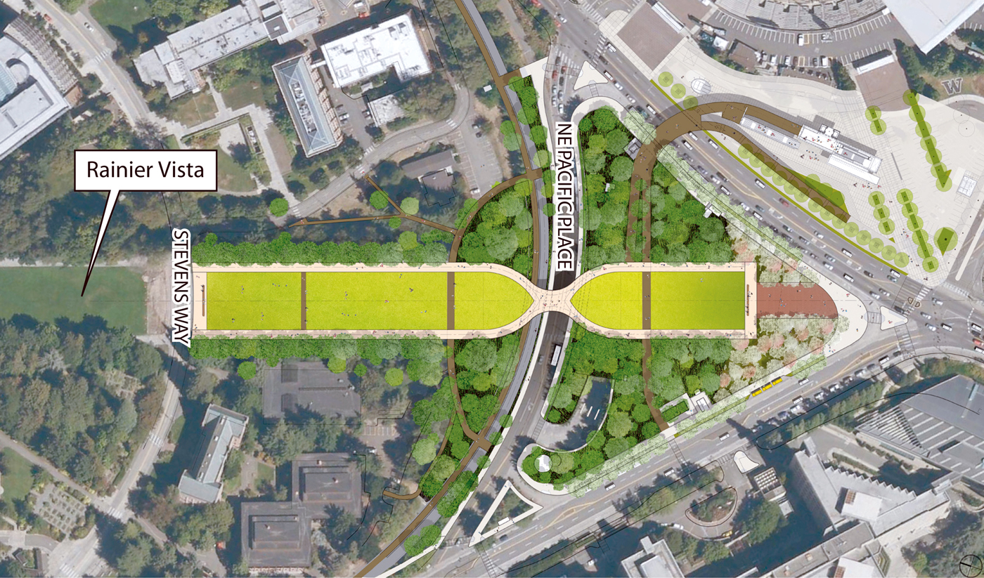 Northeast Pacific Place will be lowered and the land bridge will cross above it to separate pedestrian and bicycle traffic from motor vehicles. The portion of Rainier Vista between Stevens Way and the land bridge will be filled and landscaped.
