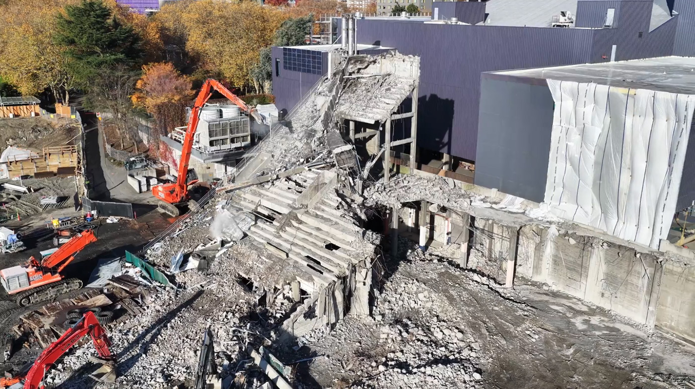 Crews removed the final grandstand column last week. They crane picked about 40 pieces of concrete from the grandstand, carefully avoiding neighboring McCaw Hall.