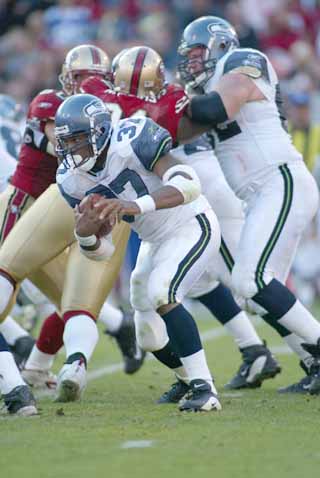 Seahawks running back Shaun Alexander, who led the National Football League in rushing last year, was held to 51 yards against the Detroit Lions on Sunday.