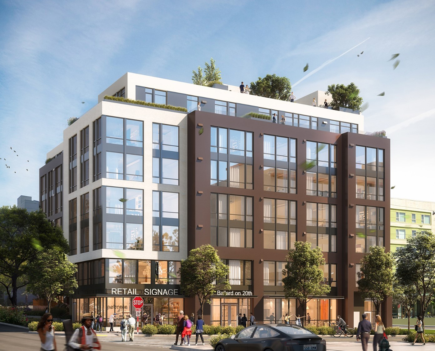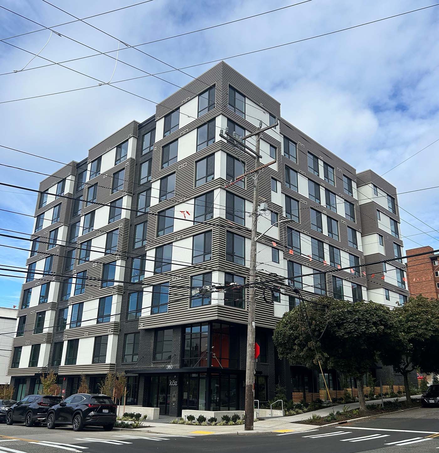 As the DJC reported in April, Saratoga Capital then started on two facing Ballard apartment projects, east (pictured) and west, totaling about 124 units. GGLO is the architect and W.G. Clark the builder. Last month Colliers announced that it had arranged a $33 million construction loan for what are now dubbed The Pacific and The Cascades. Banner Bank was the lender, with the note carrying an initial three-year term. Colliers' Mark Plenge led the financing effort, and said in a statement, “So many ground-up new construction developments in the past two years have just not penciled out, but in this case Colliers Mortgage was able to negotiate the most favorable and lowest-cost terms from Banner Bank to enable this project to sensibly move forward.” Completion is expected in 2027.
